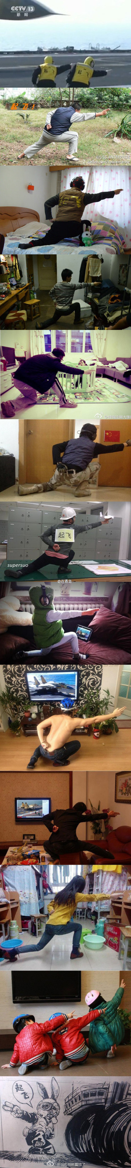 遼寧艦起飛指揮員引導艦載戰(zhàn)斗機起飛時的場景 ????隨著殲-15在“遼寧號”航母上順利著艦,艦載機指揮員下達起飛指令的手勢也走紅網(wǎng)絡。充滿動感的凌空一指被網(wǎng)友戲稱為“走你”,成為繼騎馬晃襠式后最火的招式,各路網(wǎng)友紛紛發(fā)出神PS及親身模仿的喜感圖片。 ????熱度: ????網(wǎng)友聲音: ????人民日報 :【你好,明天】航母style走紅,用生命造就艦載機完美騰空的人卻倒下。喜與悲糾結(jié)反轉(zhuǎn)中人們感動痛惜,也有人認為不值甚至猜測質(zhì)疑。羅陽走了,把思考留下:多元時代,個人選擇、個性表達無可指責,但總有些價值需要堅守,如家國情懷和社會責任。瀟灑的看客心態(tài),精致的利益權(quán)衡,換不來美麗中國。安。 ????李大明白 @jsliming :【今天你“航母style”了嗎】如果你還不知道航母style,那就凹凸曼了。側(cè)屈腿,食指和中指指向飛機起飛方向,其余手指握拳,臉背對起飛方向……“航母style”昨晚登錄央視新聞聯(lián)播后,今天掀起新一輪模仿潮,出現(xiàn)大量升級版,交警版、消防版、辦公室版,各種“走你”層出不窮……