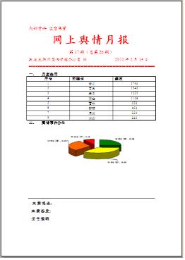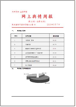 ??? 輿情監(jiān)測報告是由專業(yè)的輿情分析師運用科學(xué)的網(wǎng)絡(luò)輿情監(jiān)測理論體系、作業(yè)流程和應(yīng)用技術(shù),對傳統(tǒng)媒體網(wǎng)絡(luò)版(含中央媒體、地方媒體、市場化媒體、部分海外媒體)、網(wǎng)站新聞跟帖、網(wǎng)絡(luò)社區(qū)、微博等網(wǎng)絡(luò)輿情主要載體進行24小時監(jiān)測,對輿情事件起因、傳播載體、傳播路徑規(guī)律以及應(yīng)對策略得失等多角度進行分析而出具的。 ????輿情監(jiān)測報告能有效地提高政府、企業(yè)宣傳工作的質(zhì)量和效果,加強對輿論的引導(dǎo),準(zhǔn)確把握媒體關(guān)系和涉及政府、企業(yè)方面事件的輿論走向,應(yīng)對突發(fā)輿情事件。 ????輿情監(jiān)測報告為用戶提供專業(yè)的輿情報告服務(wù),根據(jù)用戶的需求,提供每日簡報、特定事件分析報告和周期綜合性報告等多種互聯(lián)網(wǎng)報告類型供用戶訂閱。????