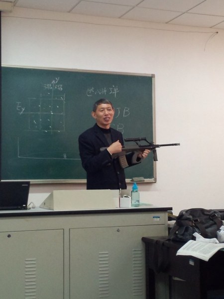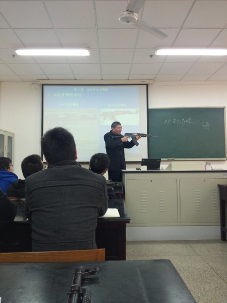 ????老師講解AK-47自動步槍。 ????老師在講臺上一手拿著AK47突擊步槍,一手拿著M16突擊步槍,這種畫面是否足夠震撼?南京理工大學有一門“自動武器構造課”,課堂上的照片流傳到網上,把網友們給“震”住了。大家感慨,“估計這個課沒人敢逃?!辈贿^同學們說,沒人舍得逃這門課,一堂課摸到30支各國槍械的機會,實在太難得。