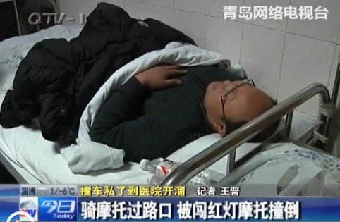 遭遇車禍被撞,就夠窩心的了,然而更讓人窩心的是,這肇事者把傷者送到醫院后竟然腳底抹油,溜了。即墨市民尹先生昨天就碰到了這么個不地道的司機。昨天下午四點,記者在即墨市人民醫院的病房里見到了受傷的尹先生。尹先生告訴記者,事情發生在中午他下班的時候,當時綠燈亮起,他騎著摩托車過馬路,卻被一輛闖紅燈的摩托車撞倒了。出事后,當事人雙方的家人也很快趕到了現場,尹先生家人也報了警,當著交警的面,雙方都簽