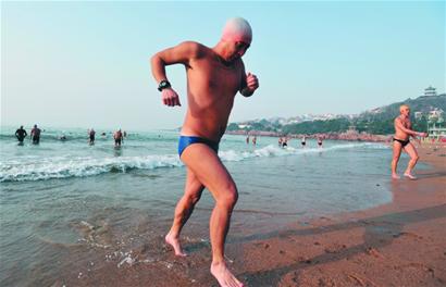 兩三分鐘后,首批下水的冬泳者開始上岸,10多分鐘后,大家陸續返回岸上,繼續鍛煉身體?!耙话愣菊呦滤褪?分鐘,能堅持到10分鐘的就是高手了?!笔卸緟f會楊主席介紹。20多分鐘后,記者發現海里還有1個人沒有上來,詢問得知,那個人是聾人冬泳隊的樊景魁,今年已經55歲。“老樊能游半個小時,厲害啊?!鄙碁┥显S多冬泳愛好者對老樊佩服有加。 (記者 趙健鵬)