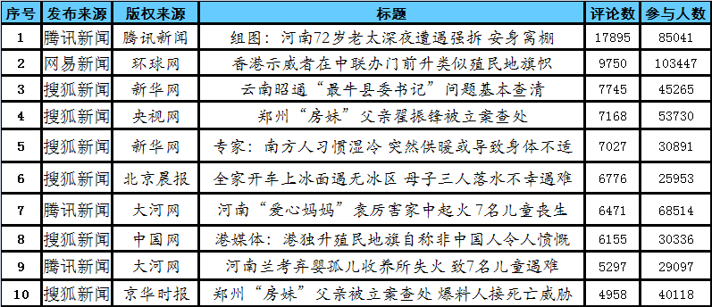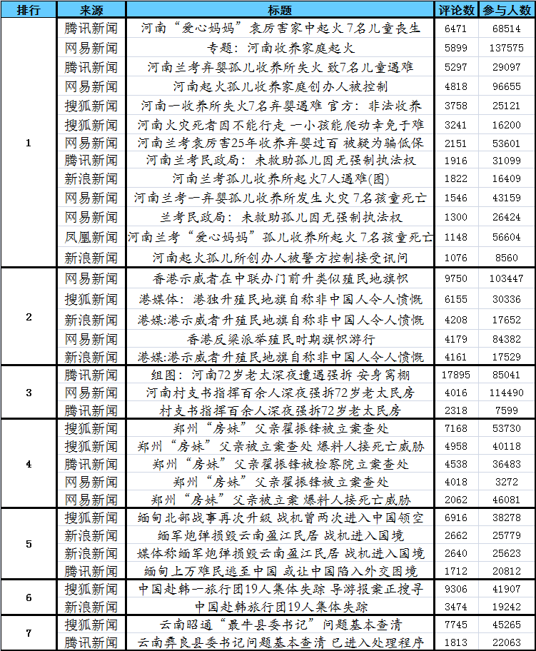 數據說明: 熱門新聞跟帖數據來源于新浪、騰訊、搜狐、網易等門戶網站24小時內新聞排行,排行依據為跟帖評論數;微博熱門話題數據來源于新浪、騰訊微博當日熱門話題排行,排行依據綜合轉推數和評論數。 |