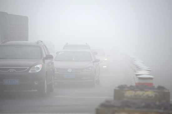 ????上午8點,跨海大橋高架路距收費站幾百米的路上,能見度不足10米,車輛行駛很困難,約15米遠的路面上看不清車牌號,只看到車尾部發出微弱的燈光,路上出現了壓車現象,路面上已排起了長長車隊,一些車輛不敢行駛停在路邊,紛紛打開霧燈。
