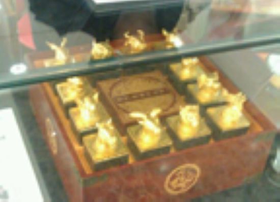 1月7日上午10時,記者在南京路某大廈一樓大廳一角找到了十二生肖金玉璽的“本市指定發行處”,在一張簡單的陳列柜里擺放著兩套“玉璽”和兩張廣告頁,一位三十歲左右的男銷售員在做產品介紹。旁邊還有其他商家的幾個陳列柜,分別擺放著郵票、紀念鈔、紫砂壺等收藏產品。記者看到:這套“玉璽”共十二尊,每尊由長寬約6cm、高約10cm左右的青黑色玉石底座和上面約5cm高的十二生肖獸首組成。拿在手里沉甸甸的,但仔細一看,金色的獸首與玉璽間的連接縫隙做工粗糙,看起來像塑料材質;描繪在底座上的 “拾貳獣首金玉璽”字樣,顏色深淺不一、筆畫不勻。