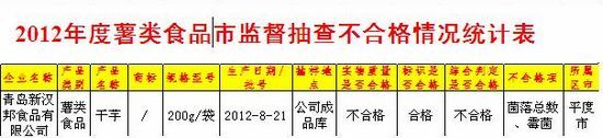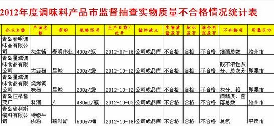 ????昨天青島市質(zhì)監(jiān)局在網(wǎng)站上公布了我市去年第四季度部分食品市質(zhì)量監(jiān)督抽檢結(jié)果,此次抽檢了肉制品、調(diào)味料、醬類、食用油脂制品、蛋制品、薯類食品6類產(chǎn)品,共抽檢了104家企業(yè)的195批次產(chǎn)品,9家企業(yè)的10批次產(chǎn)品被檢出不合格。不合格產(chǎn)品中大部分是產(chǎn)品實物不合格,僅有1批次產(chǎn)品是標(biāo)簽標(biāo)識不合格。 ????市質(zhì)監(jiān)局工作人員介紹,這些產(chǎn)品都是在去年7月至10月從企業(yè)成品庫直接取樣的。記者注意到,其中青島宏順食品有限公司生產(chǎn)的五香肉干被檢出檸檬黃、日落黃超標(biāo)。食品專家介紹,人如果長期或一次性大量食用檸檬黃、日落黃等色素含量超標(biāo)的食品,可能會引起過敏、腹瀉等癥狀,當(dāng)攝入量過大,超過肝臟負(fù)荷時,會在體內(nèi)蓄積,對腎臟、肝臟產(chǎn)生一定傷害。(記者 孫啟孟) ????其他被曝光的企業(yè)和產(chǎn)品還有: ????青島新漢邦食品有限公司的干芋(不合格項:菌落總數(shù)、霉菌) ????膠州市昌盛蛋制品廠的咸鴨蛋(不合格項:菌落總數(shù)) ????青島可頌食品有限公司的植脂奶油(不合格項:標(biāo)簽) ????青島和旺食品有限公司的黃豆醬(不合格項:食鹽項目) ????青島春明調(diào)味品有限公司的花生醬(不合格項:細(xì)菌總數(shù)) ????青島星城調(diào)味食品有限公司的大蒜粉(不合格項:酸不溶性灰分、總灰分) ????青島星城調(diào)味食品有限公司的燒烤調(diào)味粉(不合格項:灰分、鉛) ????青島恒泉醬菜廠的料酒(不合格項:酒精度、菌落總數(shù)) ????青島瑞利斯餐料有限公司的特級牛肉粉(不合格項:總氮) |