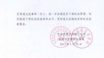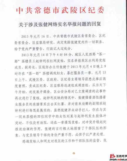 ????1月14日,一則網友的實名舉報帖出現在紅網《百姓呼聲》欄目,帖文稱“武陵區水利局副局長張健酒后調戲婦女,暴打服務員”。帖子發出后引起武陵區主要領導的重視,目前,涉事的副局長張健被免職。