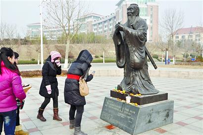????在島城一所高校圖書館前矗立著一尊孔子青銅雕像,進入期末考試季之后,孔子雕像周邊變得熱鬧起來,學生們成群結隊地來祈求孔圣人保佑自己在期末考試能考個好成績,最多的是祈禱不掛科。