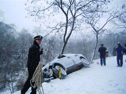 ????此時(shí),車內(nèi)被困的兩男兩女4名游客已在過路游客的幫助下爬出車外。“上午,我開車?yán)笥岩黄饋碇樯交﹫龌韧嫱炅藴?zhǔn)備離開時(shí),雪下大了,路上積了厚厚的一層雪,下山途中剛行駛了20米,車就不聽使喚了,越剎車越不受控制,當(dāng)時(shí)心里就想‘完了,完了’,幸虧有棵大樹將車給擋住了,要不然10多米高,翻下去至少是全身骨折。”駕駛員嚴(yán)先生心有余悸地說,車輛被樹擋住后,他們還是一動(dòng)不敢動(dòng),后來是過路游客發(fā)現(xiàn),幫他們從外面打開車門,他們這才依次從左側(cè)車門爬出來。“就像看電影一樣,特別擔(dān)心他們亂動(dòng),樹會撐不住,連車帶人都摔下去。”幫助救援的游客對民警說。