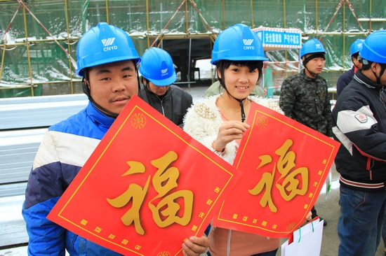 原來,女孩叫馨悅,93年生,今年剛滿20歲,來自吉林長春榆樹市懷家鎮,半個月前特意趕到青島,陪駐守工地的丈夫小許過新年。在這條件艱苦的工地上,她做不了重活,倒是成了一個很好的小“管家婆”,幫工友們打掃衛生洗衣服燒開水,每天也做不少的活。這次送春聯活動,她儼然已經把自己當成了工地上的一份子,大大方方地站在工人隊列里。
