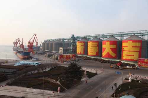 ??? 在青島港,飽含著吉祥和祝福的“新春大吉”四個大字在青島港老港區糧罐上高高掛起。這代表著青島港向一年來支持港口發展的船東、貨主、各界賓朋及廣大員工送上新年最真摯的祝福。據了解,每個大字為575平方米,四字總計2300平方米,為全國最大祝福語。