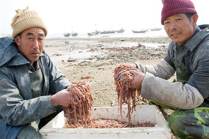 ????“捕撈海蚰蜒,一種是拖網(wǎng),另一種是釘網(wǎng)。”老李說,他們將船開出4里開外后,根據(jù)海水的流向,將一張10多米的大釘網(wǎng)撒進(jìn)了海里,不一會,10多斤的海蚰蜒就進(jìn)了網(wǎng)。隨后又下了幾網(wǎng),收獲約有百余斤海蚰蜒。老李和雇工又撒下了另一張網(wǎng),開始捕獲小魚蝦。經(jīng)過4個(gè)多小時(shí)的捕撈,老李的船艙已經(jīng)裝得差不多了,尤其是海蚰蜒,足足兩大籮筐。老李說,由于海上氣溫很低,他們出海捕撈不到10分鐘工夫,手就凍僵了。