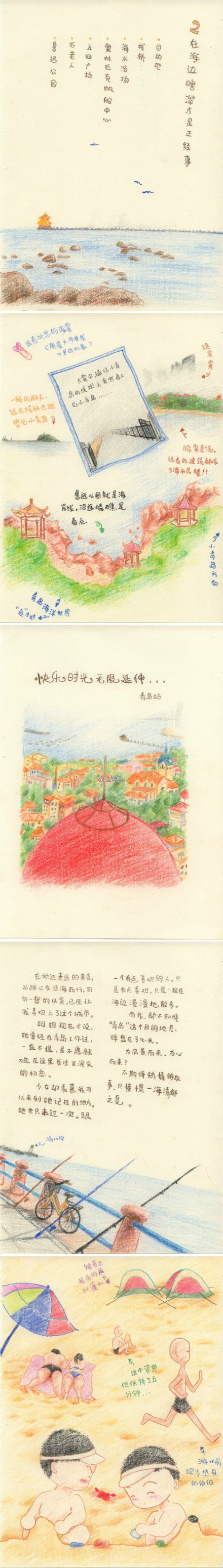 “2011年6月17日,離開住了一年的首都,向往大海邊的城。感覺這才是自己第一次真正意義上的旅行。吹著濕潤的海風(fēng)雨霧,流連在寧靜的老建筑山路,畫著悠然,心意舒懶,這就是我想要的吧:快樂時(shí)光無限延伸,青島站。”最近,一個(gè)名為《我用色彩表述生活,耗時(shí)一年完成的青島旅行繪本》的帖子被網(wǎng)友頻繁轉(zhuǎn)載,繪本的主角是青島風(fēng)景,而繪本的主人是一名曾經(jīng)來青旅游的佛山女孩。昨天,記者聯(lián)系