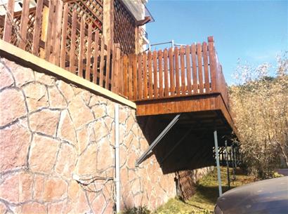 在小區4號樓前,三名工人正在拆除一排金屬支架。一名工人告訴記者,這里之前的結構就像海邊的木棧道,加寬兩米用支架固定后,直接把門口走道加寬了近兩米。 “支架搭起來沒超過一個月,你看木頭都是新的,不知為啥,房東讓我們都拆掉。”