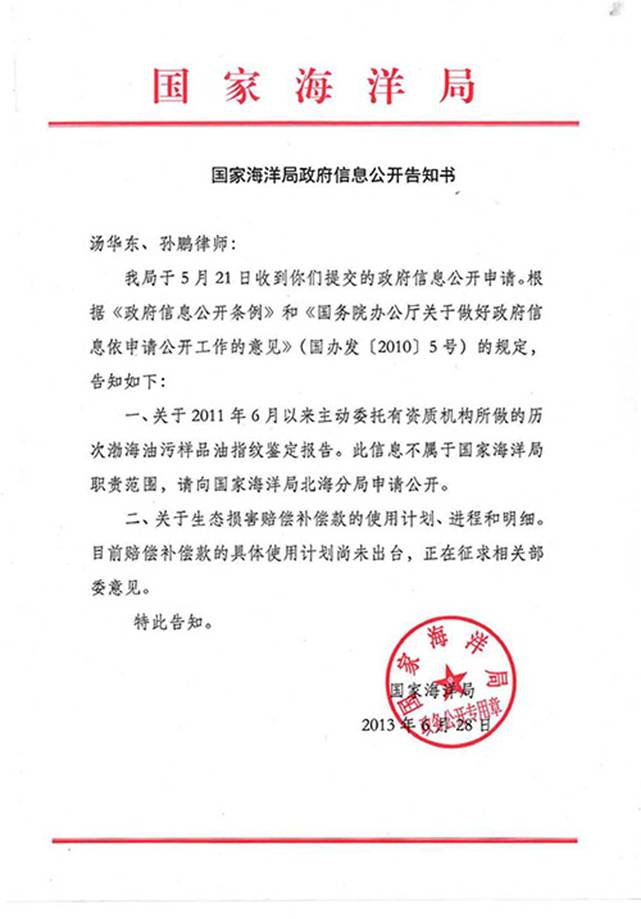 ?在渤海受蓬萊19—3油田嚴重污染兩周年之際,7月1日北京德和衡(上海)律師所湯華東律師收到國家海洋局政府信息公開告知書,被告知:關于(渤海)生態損害賠償補償款的具體使用計劃尚未出臺,正在征求相關部委意見。對此,湯博士憤怒地表示:渤海受油污損害的前兩年對生態補償恢復至關重要,國家海洋局居然收錢不辦事,這是再次給渤海傷口撒鹽,是玩忽職守瀆職犯罪。是可忍孰不可忍?!對于國家海洋局認為油指紋鑒定應向其下屬的國家海洋局北海分局另行申請要求信息公開,湯博士認為這是典型的刁難民眾官僚主義表現。 ?????? 國家海洋局政府信息公開告知