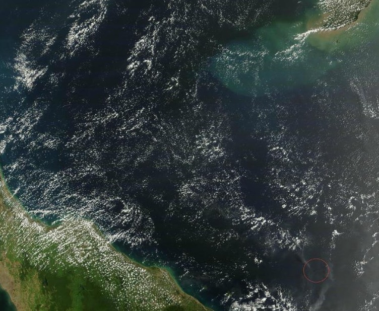????據(jù)美國(guó)宇航局發(fā)布的圖片顯示,北京時(shí)間3月9日11:35,NASA的衛(wèi)星Terra/MODIS拍攝了相關(guān)海域的一張250米精度的衛(wèi)星圖像,圖片定位約在104.6 E,6.1 N,右下角紅圈疑似馬航370失事地點(diǎn)。