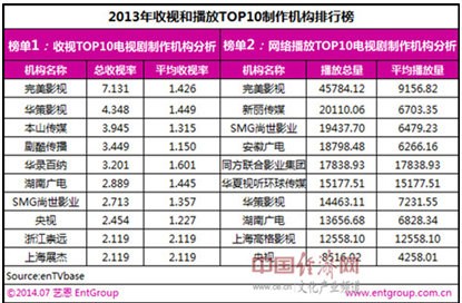 ????相關數據表明:2013年收視TOP30電視劇的制作機構除了“央視”、“湖南廣電”外,其他均是民營制作機構。其中,完美影視表現尤為搶眼。在2013年收視率前30的電視劇中,完美影視憑借《咱們結婚吧》、《陸貞傳奇》、《打狗棍》、《小爸爸》、《老有所依》占據5席,位列第一陣營。而綜合電視臺收視率與網絡播放看,在TOP30的劇目中,完美影視的總收視率和播放總量均排名第一,超越傳統的業內“大佬”,成為名副其實的中國影視劇“一哥”。