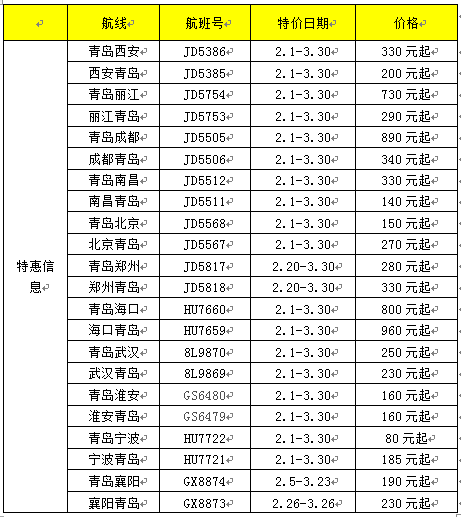 1月29日,從海南航空商委青島營業部獲悉,為了滿足春運大量旅客的出行需求。海南航空商委聯合旗下航空公司海南航空、首都航空、天津航空、祥鵬航空、北部灣航空近期在青島=西安、麗江、成都、南昌、海口、北京、武漢、鄭州、淮安、寧波、襄陽等多條航線推出特價機票,部分特價機票為1至3折。