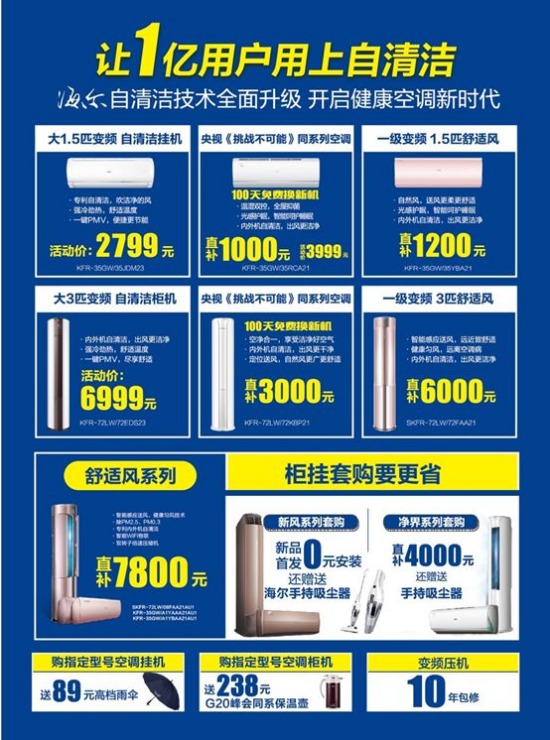 驚喜二、免單禮:海爾空調30年老用戶,憑發票(或機器編號)及照片,可免費更換海爾第二代自清潔空調