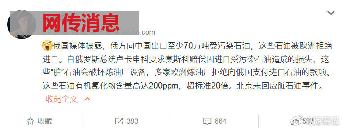 近日網傳一條來自外媒的消息稱,俄羅斯向中國出口了70萬噸受污染的石油,這些石油曾被歐洲拒絕進口。一時間,“關于俄羅斯太不厚道,中國甘愿‘接盤’”的討論充斥網絡。