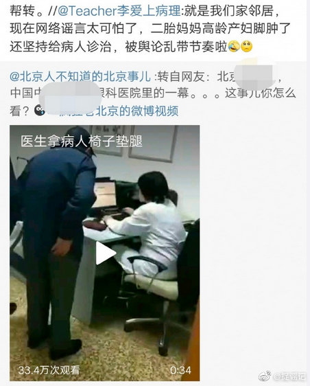 近日網傳一則視頻稱,在北京某眼科醫院,一位女醫生在值班坐診時,將本該是患者坐的凳子放在自己腳下,卻讓一旁的年邁患者站著看病。視頻稱,這是醫德有問題。對此,微博介紹為北京知名三甲醫院醫生的博友@Teacher李愛上病理辟謠指出,視頻中的女醫生正是他的鄰居,這位女醫生其實是一名懷了二胎的高齡產婦,因為腳腫的厲害,但又堅持為病人問診,所以才出現了視頻中的一幕。
