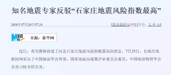其實,這是一份2004年就公布的報告,曾在數次地震之后引起各方強烈“圍觀”,在2008年和2013年,就已經有專家專門進行過辟謠。而《30個省級城市地震風險出爐石家莊最高上海最低》這份報告是一個研究生的論文,專家已經駁斥其論點,作者本人也已經承認觀點錯誤并道歉。
