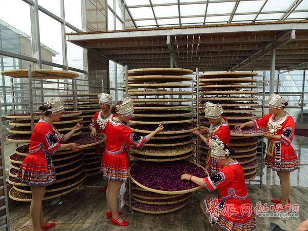 ▲工作人員身著少數民族傳統服飾在晾曬處理玫瑰花。