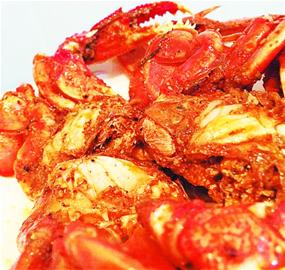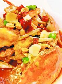 麻辣蟹:川菜風味 中航酒店廚師長張磊在成都進修交流,用川菜的辦法做海捕蟹,很受當地人喜歡。他介紹,螃蟹用刷子刷干凈,揭開蟹殼,大斬八塊。蔥姜拍散。用淀粉把蟹肉處封住。