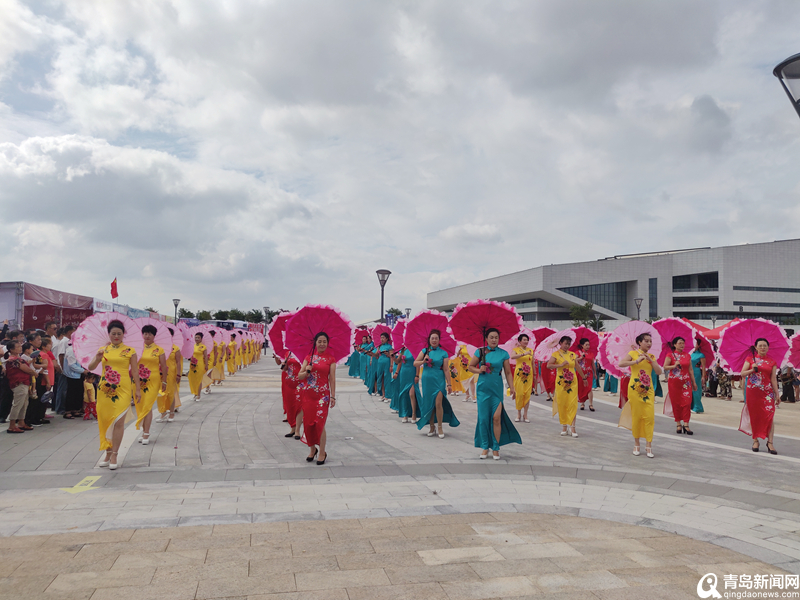 響應(yīng)時(shí)尚青島建設(shè)號(hào)召,開幕式上,舉辦了盛大的文藝演出。靚麗的身影、多彩的旗袍,再加上紅色的油紙傘舞動(dòng),120人參演的獻(xiàn)禮國慶大型旗袍秀,40人一組以“紅黃綠”三種主題顏色擺出“國”“慶”“70”字樣,向偉大祖國70華誕獻(xiàn)禮。“在這樣一個(gè)日子,能參加演出,還有這么多人看,真是非常開心,也非常有紀(jì)念意義。”參演人員紛紛表示。
