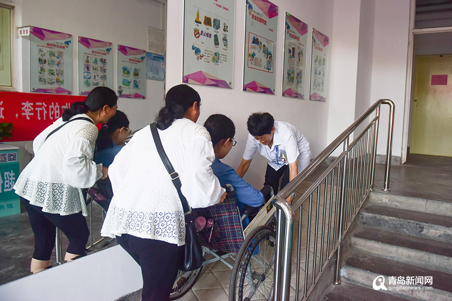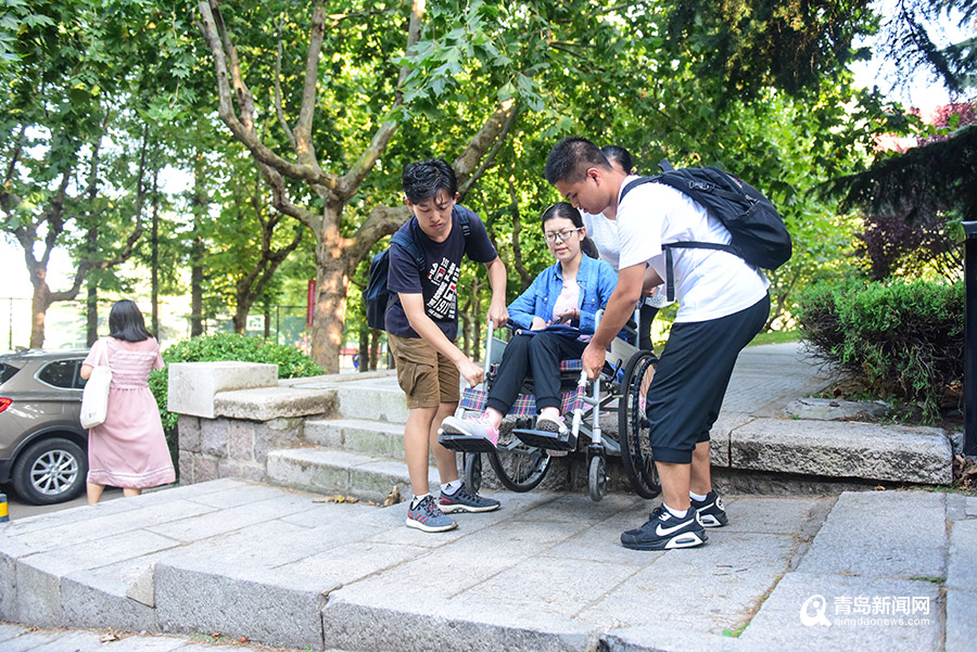 外出時,見到推著輪椅的母女倆上下臺階,很多同學會主動上前幫忙。