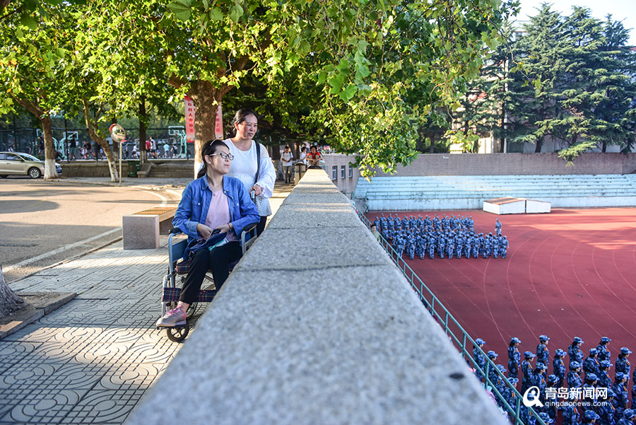 9月9日,青島大學體育場的口號聲此起彼伏,為期15天的軍訓拉開帷幕。林蔭處,蔡東曉坐在輪椅上靜靜望著“藍色迷彩大軍”,她指著距離較近的一個方隊向記者介紹:“這就是我們班。”