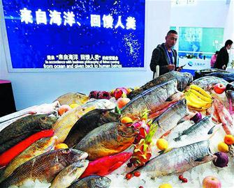 本屆博覽會上亮相的各種海鮮。王偉攝