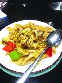 這也是道白菜和海鮮的搭配。即墨鼎隆山莊的總經理崔松嶺廚師出身,擅長把海鮮和蔬菜搭配制作菜品。白菜嫩葉撕成片。筆管魚洗凈,鍋燒開,放姜片和筆管魚焯水控干。大蒜搗成泥加生抽和香油拌勻。把白菜葉、筆管魚和蒜泥拌勻即可。