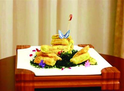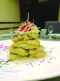鍋塌是魯菜的一種傳統技法,由于制作稍顯麻煩,很多酒店不太愿意做。四流南路的柒號院飯店還秉承著老的傳統制作工藝。柒號院的廚師長楊明翟介紹,白菜葉開水稍燙,抹上蝦泥修成方形,拖蛋液入鍋內煎成兩面金黃,加高湯小火燜至湯汁濃稠即可食用。