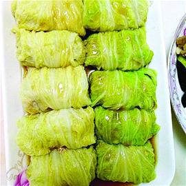 這道菜也是膠州、城陽等地的百姓菜品。廚師出身的史勝強現在擔任鑫復盛餐飲公司服務中心總監,善于從百姓的菜品中尋找靈感。這道菜就是史勝強在膠州看到的,加以改進,增加了肉餡和海米,味道更濃郁。史勝強介紹,把膠州大白菜的菜幫和老葉剁餡加肉餡和泡好的海米調味,嫩葉部分上鍋蒸軟做皮。用白菜葉包裹白菜餡兒上籠蒸熟即可。