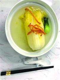 這道菜是青島的特色菜品,也是選用清澈的雞湯配上干的扇貝柱和白菜制作而成。為了菜品的營養和感官,加了蟲草花和枸杞。這些原材料在市場都很容易買到。膠州賓館的鮑魚房主管石樹家介紹,瑤柱用溫水泡半小時,蟲草花、枸杞洗凈。大白菜葉去幫撕成片。白菜葉焯水過涼攥干水,分入盅里。把泡好的瑤柱蟲草花枸杞放在白菜上。清雞湯調好味加在盅里。放入籠屜蒸1小時即可。