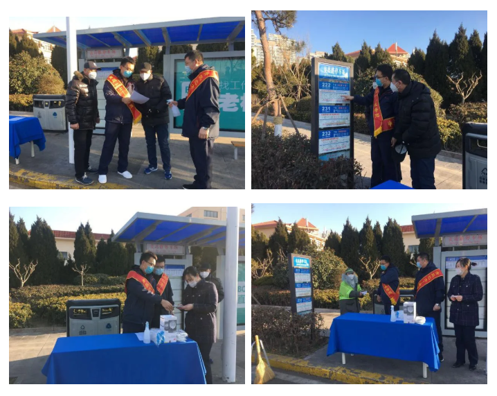 在線下,青島市慈善益站青島公交嶗山巴士第六分公司的志愿者們紛紛走上站頭大力宣傳怎樣預防新型冠狀病毒和怎樣做好個人防護等問題,并宣講“盡量少出門,出門戴口罩,在家勤洗手、常開窗”等防疫知識。