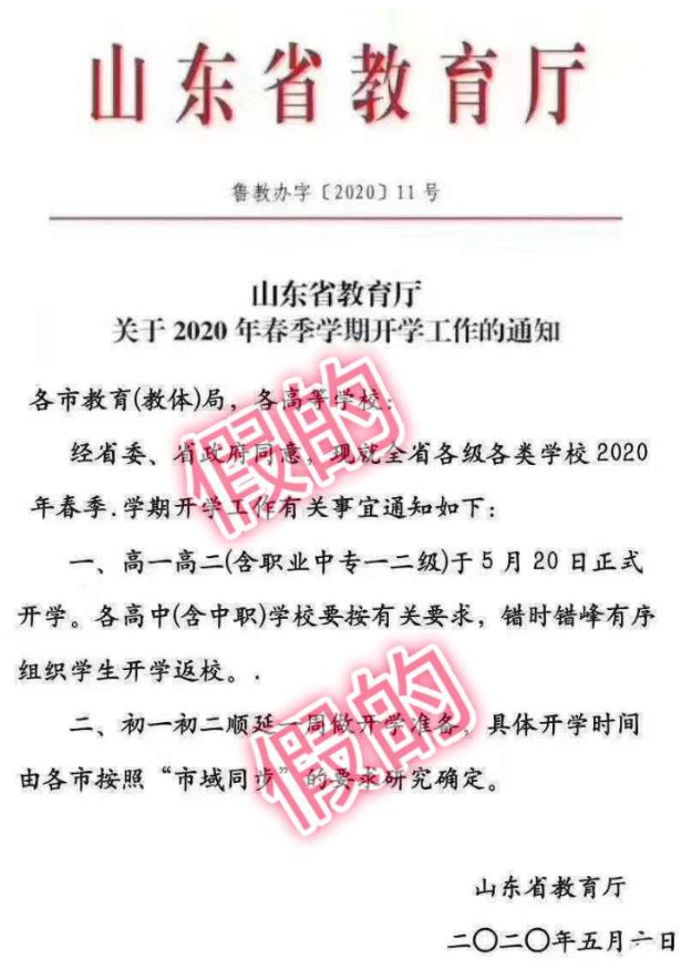 齊魯網·閃電新聞5月7日訊近日,網上一張截圖引起一些學生和家長關注。截圖顯示:山東省教育廳下發通知,經省委、省政府同意,高一高二年級將于5月20日正式開學。很多盼望開學的學生家長,看到之后將信將疑。