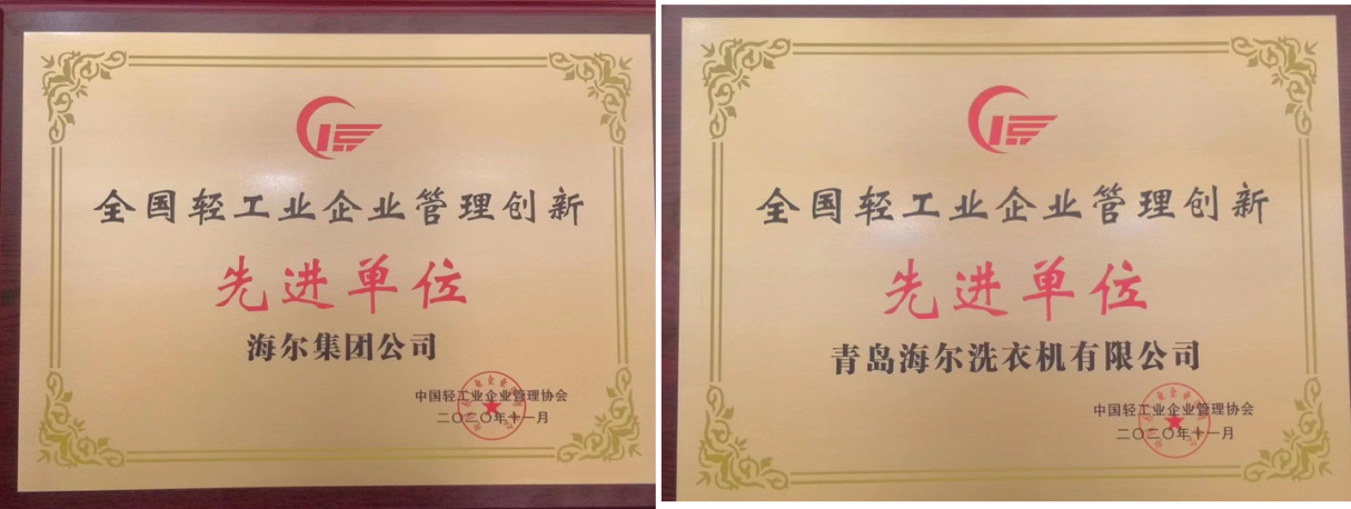 11月26日,中國輕工業企業管理協會第五次會員大會暨五屆一次理事(擴大)會議在北京召開,中國輕工業聯合會黨委書記、會長張崇和、工業和信息化部消費品工業司二級巡視員張軍發表講話,會議發布了2020年度中國輕工企業管理現代化創新成果、企業管理創新先進單位等多項榮譽,海爾人單合一模式創新成果再獲權威認可,海爾集團公司、青島海爾洗衣機有限公司獲得“全國輕工業企業管理創新先進單位”,同時海爾2項管理成果均榮獲企業管理創新成果一等獎,成為本屆獲得一等獎最多的企業。