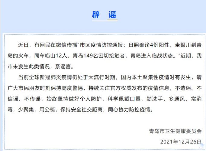青島新聞網12月26日訊(記者 李麗濤)近日,有網民在微信傳播“市區疫情防控通報:日照確診4例陽性,坐銀川到青島的火車,同車嶗山12人。青島149名密切接觸者,青島進入臨戰狀態。”青島市衛生健康委員會對此進行官方回應:我市未發生此類情況,系謠言。