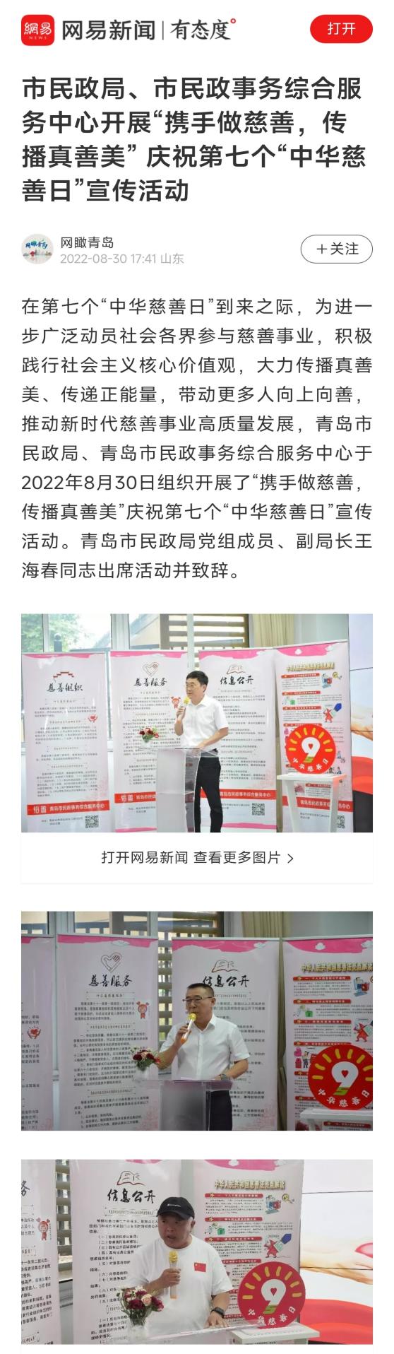 網瞰青島(網易號)2022-8-30:市民政局、市民政事務綜合服務中心開展慶祝第七個“中華慈善日”宣傳活動