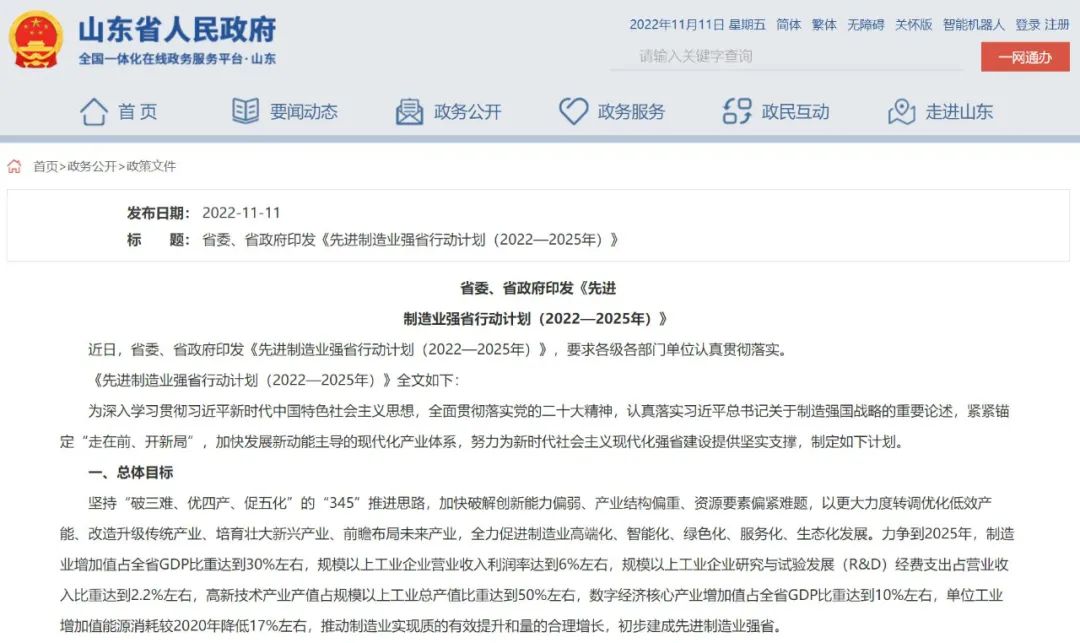 近日,山東省委、省政府印發《先進制造業強省行動計劃(2022—2025年)》(下稱《行動計劃》),力爭到2025年,制造業增加值占全省GDP比重達到30%左右,推動制造業實現質的有效提升和量的合理增長,初步建成先進制造業強省。