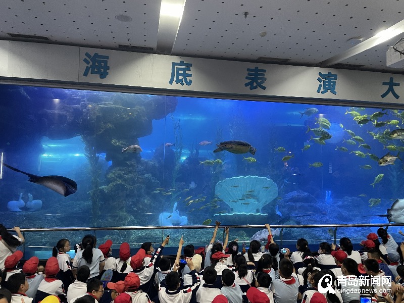 如果說校內活動還不夠孩子們一展拳腳,那研學旅行又為他們提供了更多探究的場景。帶著前期的探究思考與階段成果,南仲小學的全體師生來到“青島海底世界”,在這里上了一堂別開生面的藝術融合課,去親身體驗海洋世界的獨特魅力。
