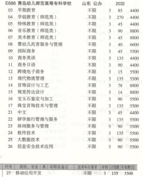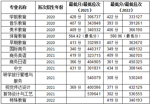 12個往年招生志愿(排名分位次先后):中文、學前教育(師范類)、特殊教育(師范類)、商務英語、早期教育、美術教育(師范類)、音樂教育(師范類)、視覺傳達設計、商務日語、國際商務、研學旅行管理與服務、首飾設計與工藝。