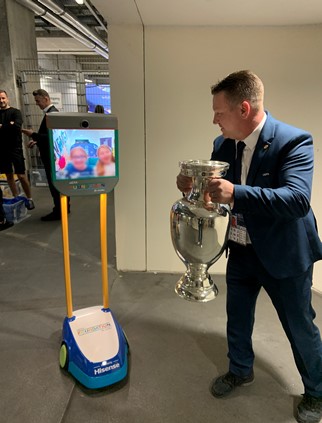 自6月14日歐洲杯開賽以來,印有醒目海信logo的互動機器人活躍在賽場周邊。通過小小的一塊屏幕,不同國家的住院兒童可以參觀平時無法進入的球員賽前熱身區、球隊更衣室等區域,跟自己喜歡的球員或者球隊進行實時互動。借助這種方式,無法親自前往球場的孩子們離自己的足球夢想更進一步,親切地體會到足球運動的樂趣。