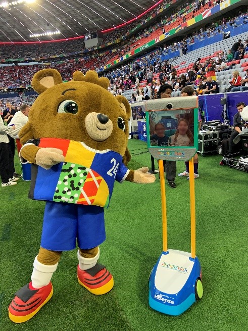 來自法國里昂的癌癥治療中心的住院兒童通過機器人參觀了法國隊更衣室,并與法國隊球星姆巴佩、吉魯、格列茲曼等進行了親密互動,同時通過機器人在球場周圍觀看了球員熱身,隨后進入了球場VIP長廊,與法國足協主席菲利普·迪亞洛進行了互動。除此之外,意大利著名守門員布馮,以及現役主力門將多納魯馬、葡萄牙球星C羅、佩佩、萊奧、若塔等均在比賽前,依次通過機器人與連線的小朋友進行了互動,積極參與到助力兒童圓夢歐洲杯的公益活動中。