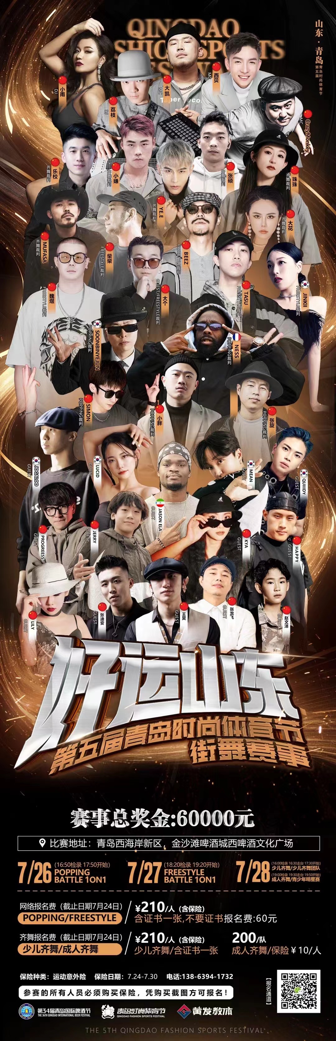 舞力全開、決戰巔峰!此次青島時尚體育節國際街舞大賽我們邀請到了來自法國的世界街舞冠軍大滿貫popping神級大師NESS;韓國超強街舞新生代戰神SOONBIN;力量與美的完美融合waacking女神Jinkii;明星演藝人MEAN、風格舞者Jogaloo、Lucid和Quiiidy;來自赤道幾內亞的Hippop嘉賓Jason及圈內多位國際級街舞裁判與嘉賓進行比賽判罰與表演,史詩級裁判陣容空前絕后,為大賽提供專業性的有力保障。更有來自Cruise Staff 娛樂部的專業DJ-LITCHI與中國街舞國家隊locking代表隊成員-CRAZY MONKEY做為MC強強聯合,用勁爆的音樂與專業的解說來點燃現場氣氛,掀起青春浪潮,引爆夏日激情。還有神秘的裁判秀給市民游客一場精彩的視覺盛宴。