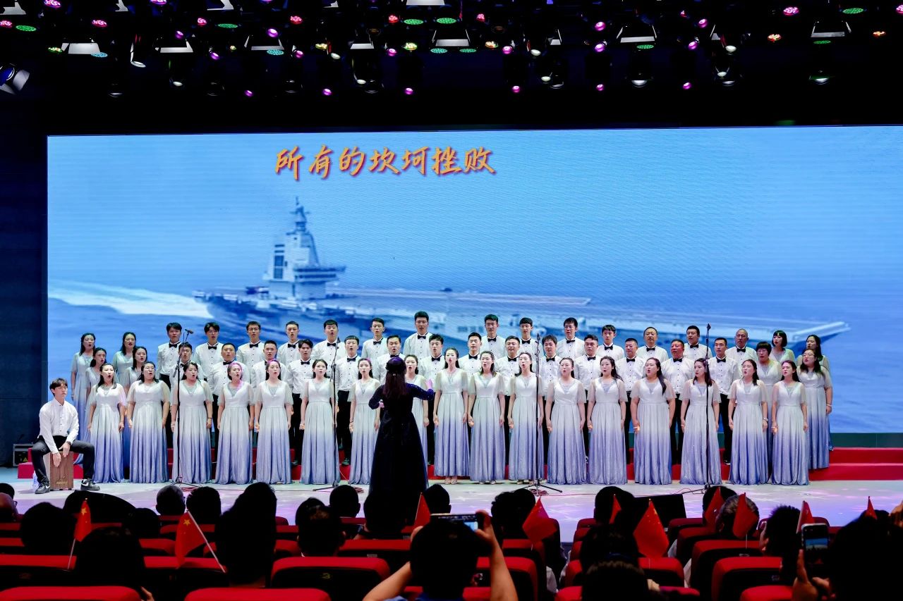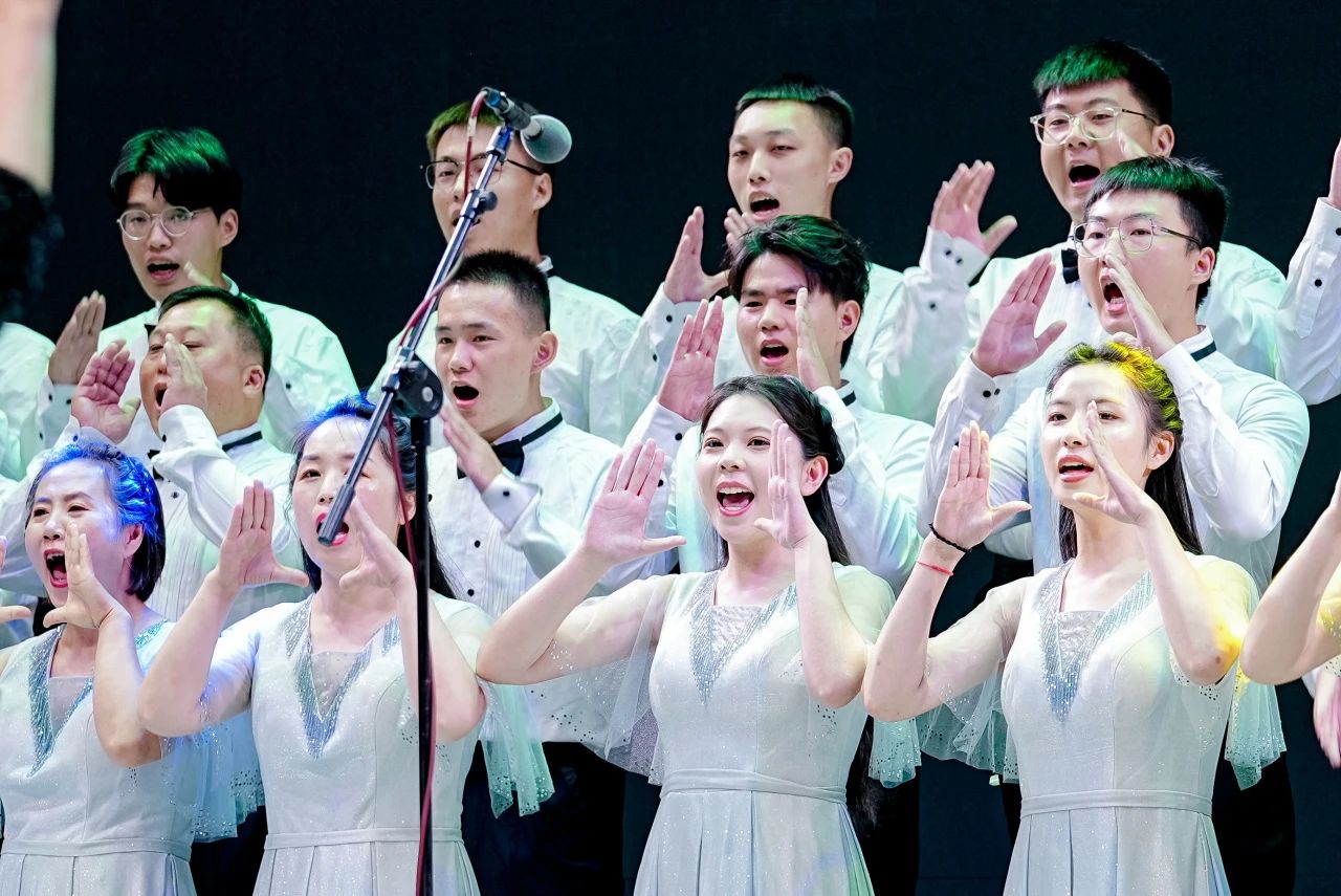 比賽在歌曲串燒《我愿+國家》中拉開序幕,隨后,《不忘初心》《星辰大?!贰渡洗荷健贰对跔N爛陽光下》《萬疆》《光亮》等一首首耳熟能詳的經典歌曲輪番上演,曲調時而高亢激昂,時而柔和婉轉,各參賽隊伍將歌曲中蘊含的情感演繹得淋漓盡致,唱出了對偉大祖國的深情和熱愛,引得臺下觀眾掌聲不斷。