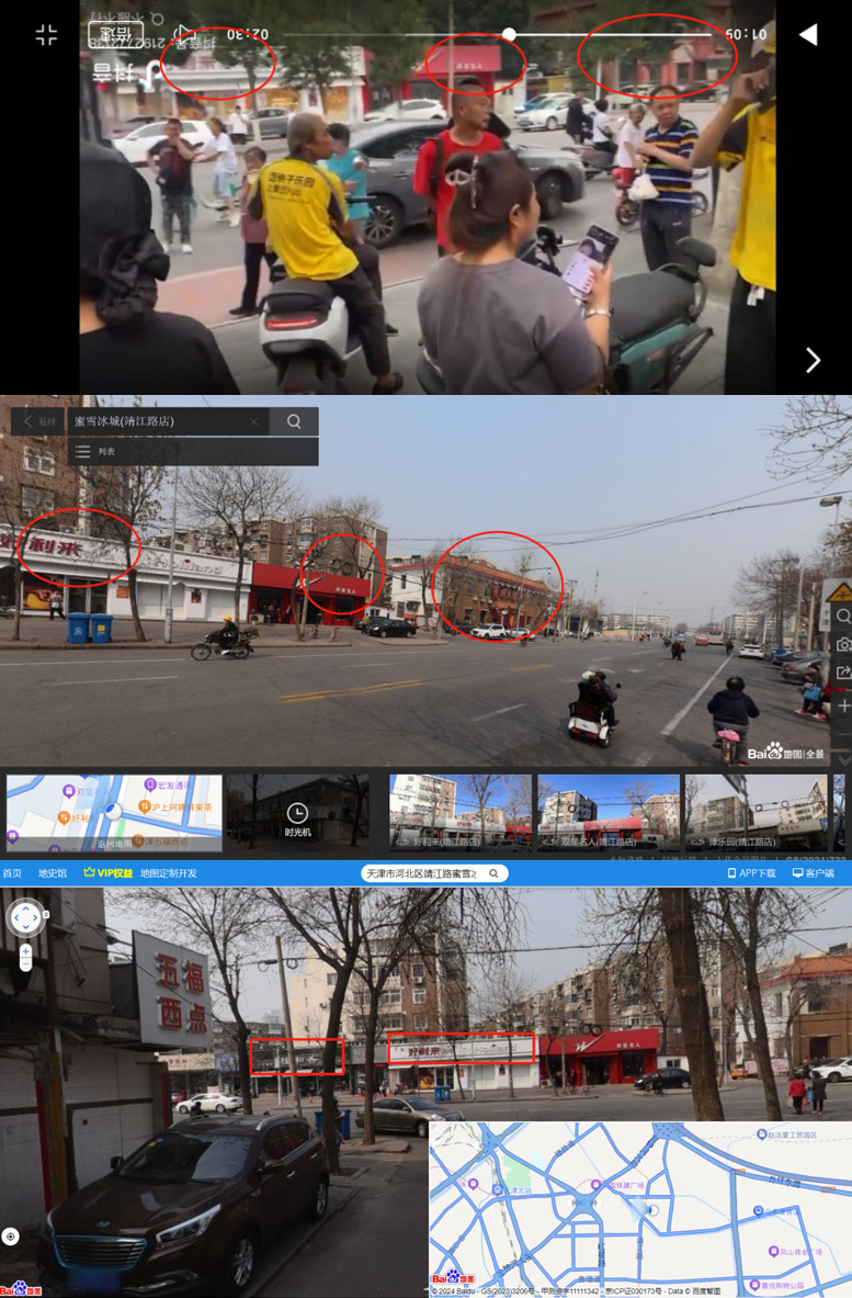 (在百度地圖搜索天津市事發地點某連鎖飲品店,視頻中的場景和當地地圖街景高度相似。最上方圖為網友爆料事件視頻截圖,下面2張圖片為百度地圖街景圖。)