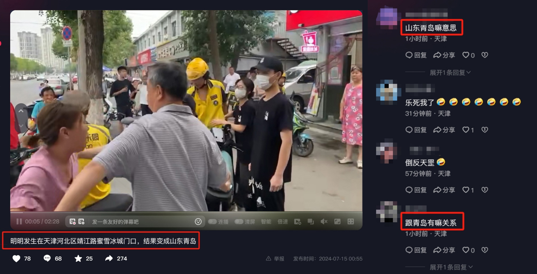 記者聯系上了該事件完整視頻的發布者。該網友表示,視頻中的事件發生地點為天津市某連鎖飲品店的門口,并非發生在山東省青島市。而且在視頻的標題文案和網友評論中,也提到“明明發生在天津,結果變成山東青島”“跟青島有嘛關系”。