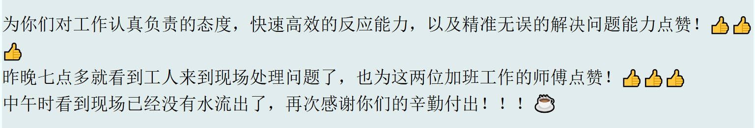 網友隨即跟帖點贊處理結果:“為你們對工作認真負責的態度,快速高效的反應能力,以及精準無誤的解決問題能力點贊!昨晚七點多就看到工人來到現場處理問題了,也為這兩位加班工作的師傅點贊!中午時看到現場已經沒有水流出了,再次感謝你們的辛勤付出!”